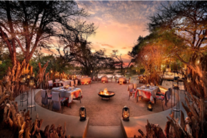 Savor gourmet meals under the African sky, illuminated by lanterns and stars.